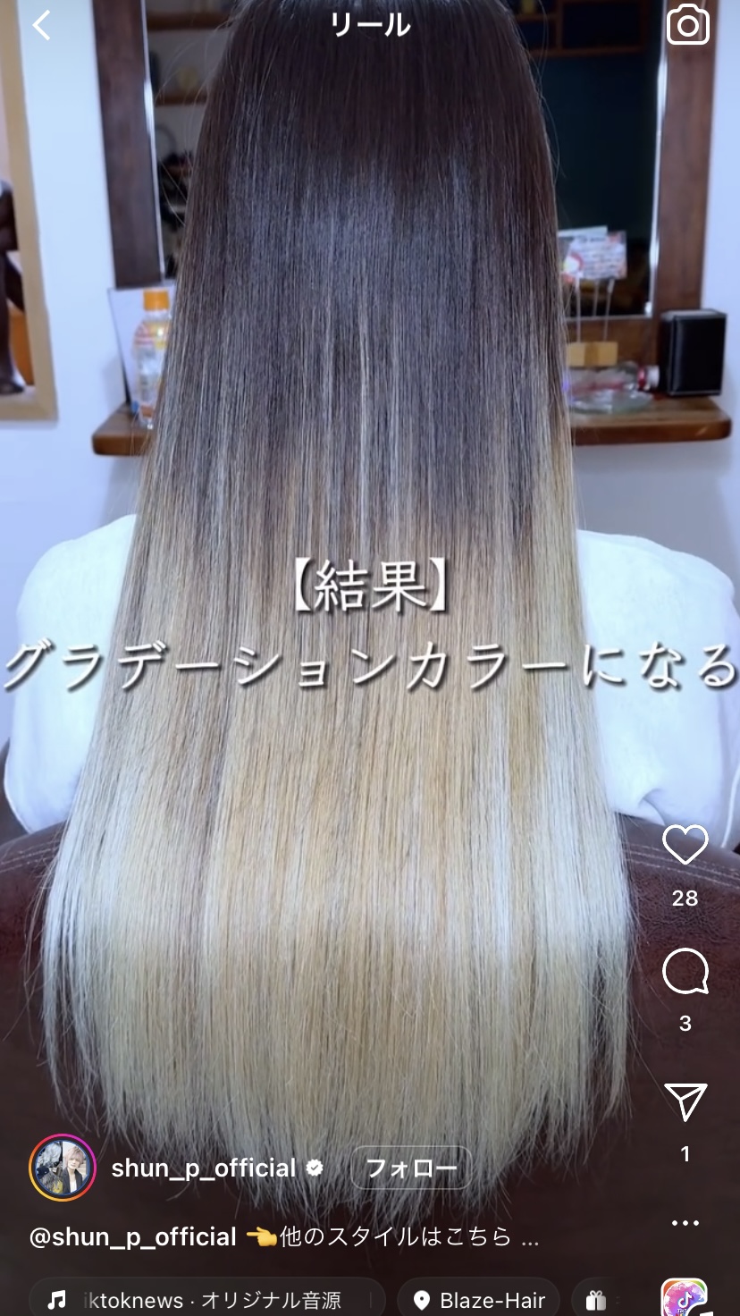 バレイヤージュをした一年後のヘアスタイル(SHUNさんInstagram リール動画より引用)