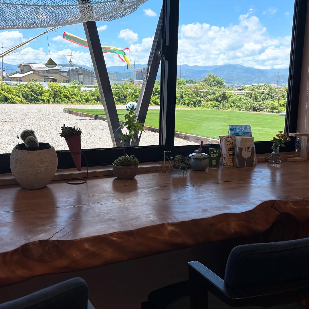 店内に一歩足を踏み入れると、まず目を奪われるのが、大きな窓から差し込む柔らかな自然光と、その先に広がる山々の美しい景色。
