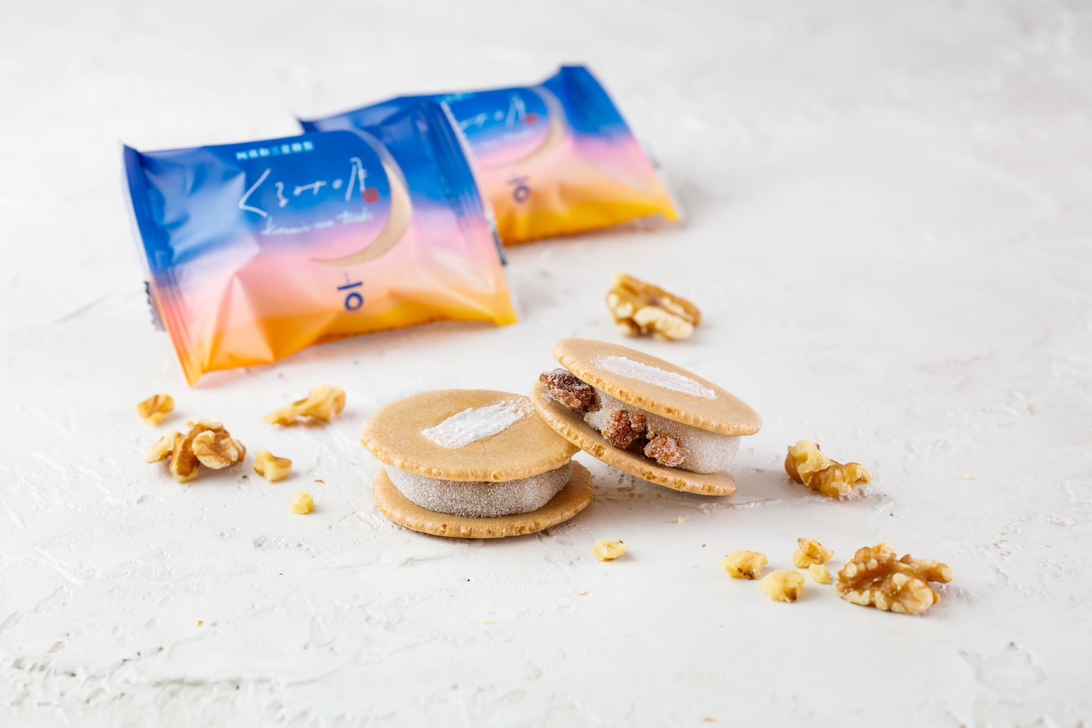 クルミ入りキャラメルヌガーを求肥餅で包み、麩焼きせんべいでサンドした和洋折衷の一品。