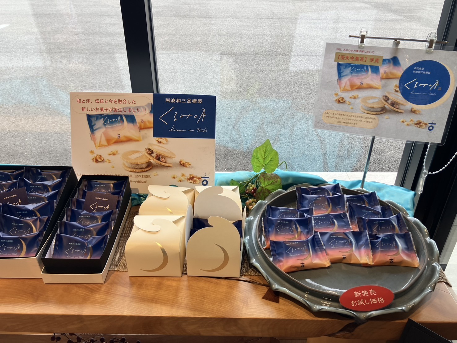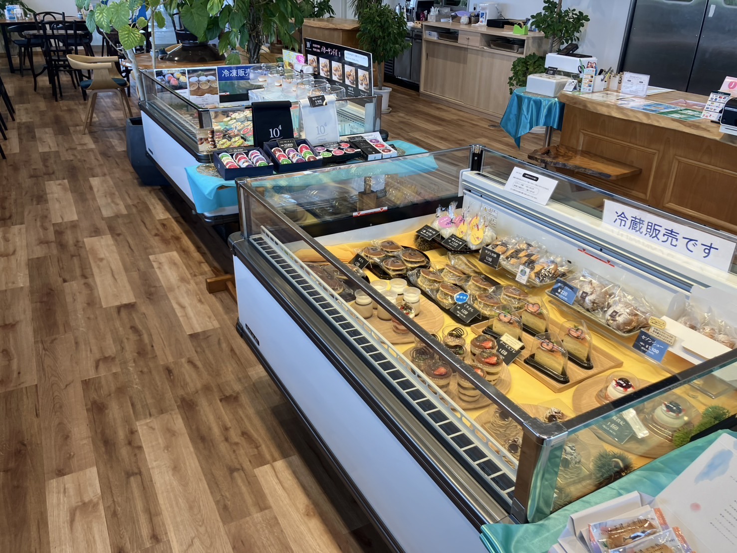 併設のショップには、人気の「バターサンドA’s」に加え、「くるみの月」や「お堰の小舟」など、和と洋の技術を融合させたオリジナルスイーツが並びます。