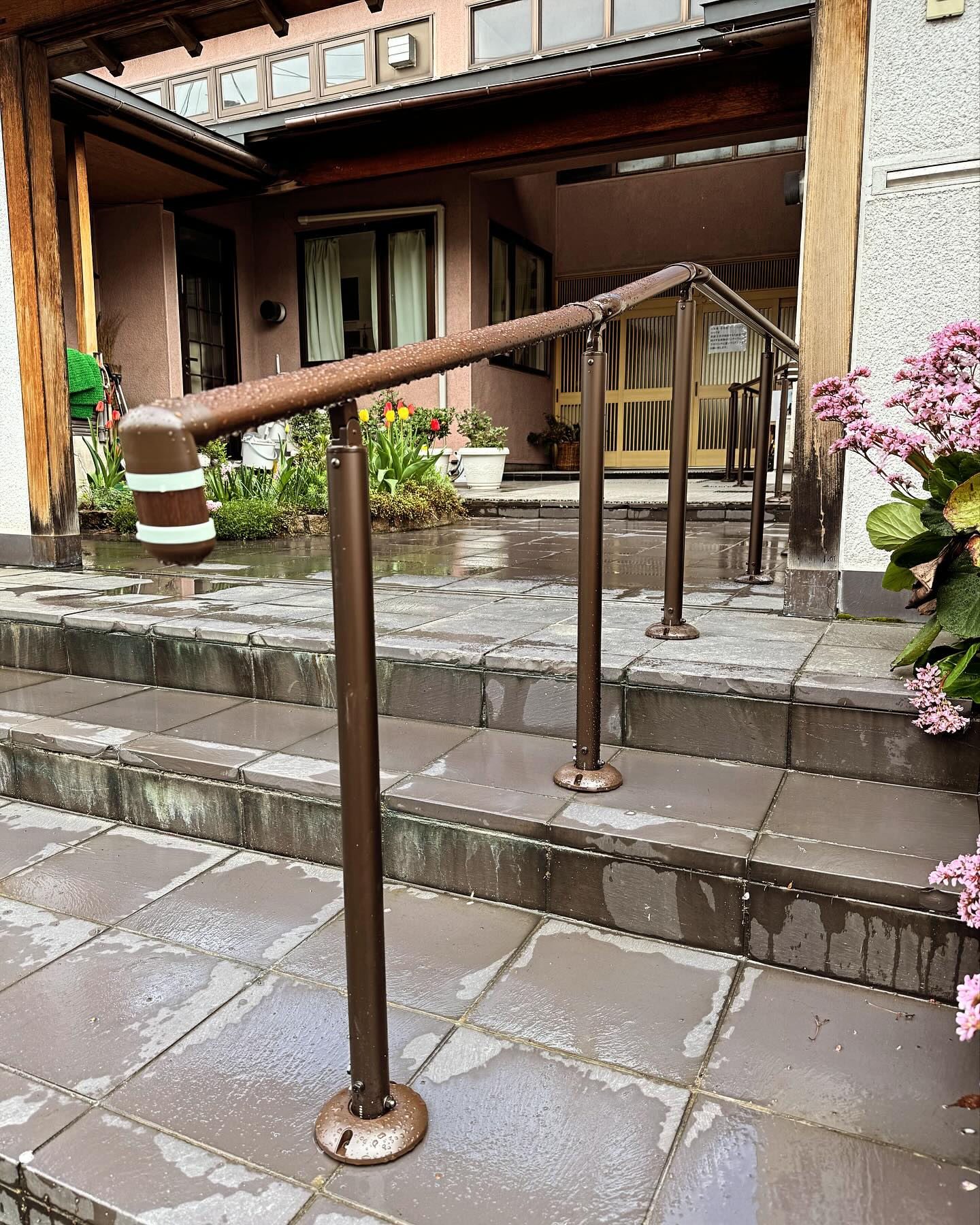 玄関前に設置された手すり。オーナー様の身長や動線、握りやすい高さなどを考えて設計します。