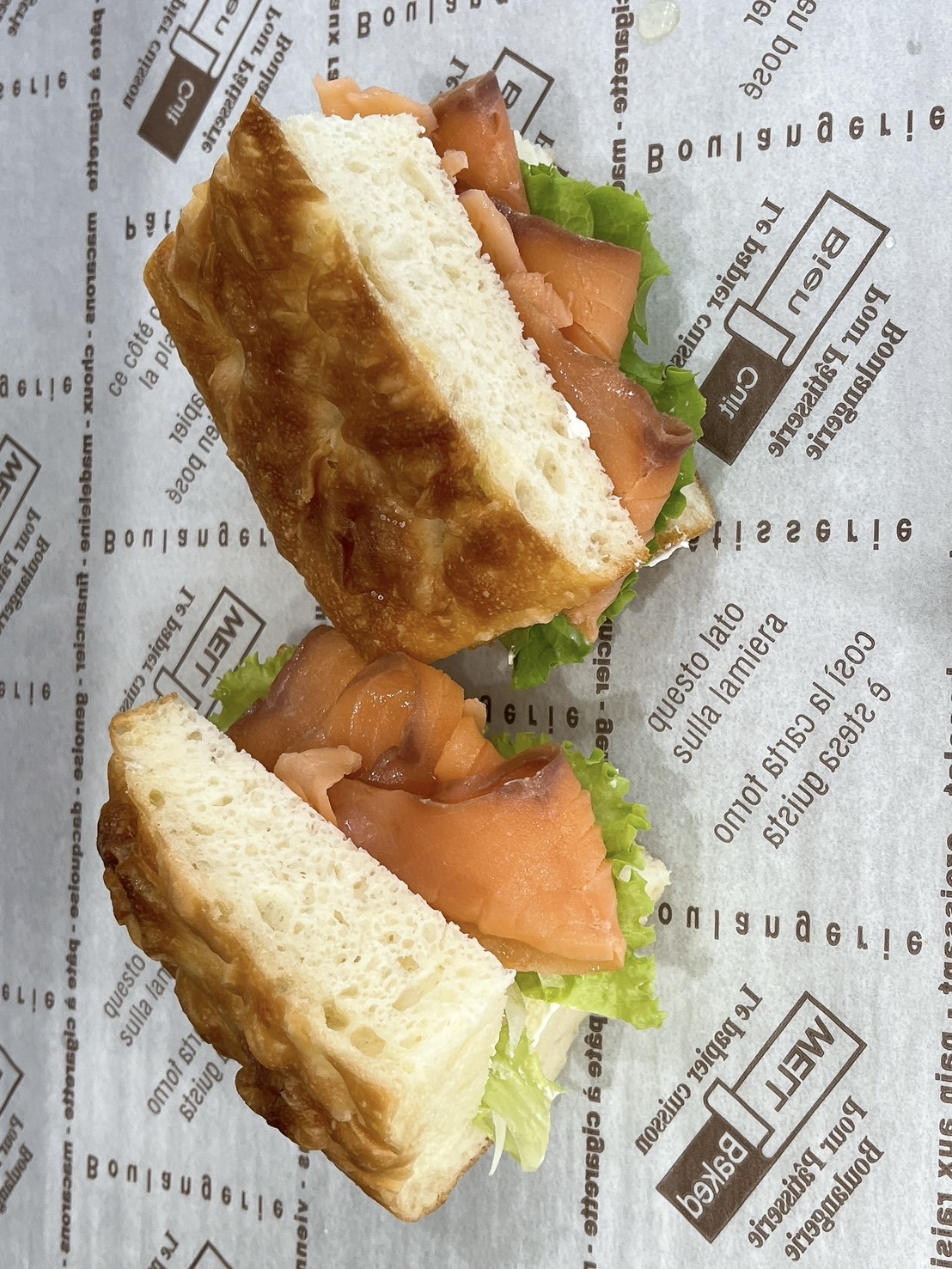 しっとり柔らかい自家製フォカッチャに、スモークサーモンを挟んだ贅沢サンド。香ばしいサーモンの香りとパンのもちもち食感が絶妙で、食べるたびに幸せな気分になります。
