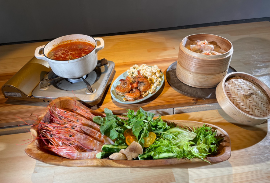 メインディッシュでは、テーブルに設置されたBBQ囲炉裏を使用し、シュリンプツリーや海老しゃぶしゃぶをお楽しみいただけます。