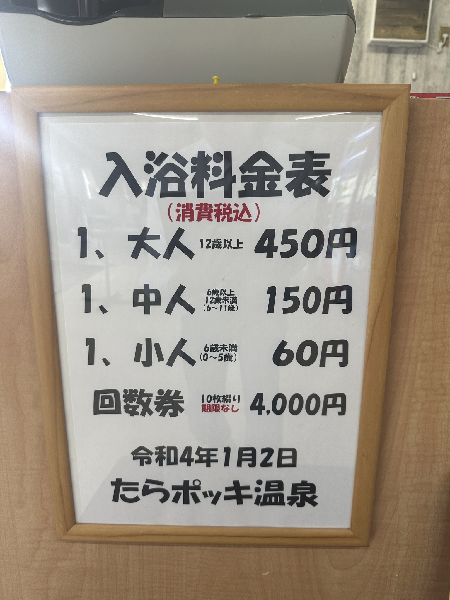 入浴料:大人450円 中人150円 小人60円 回数券10枚綴り4,000円