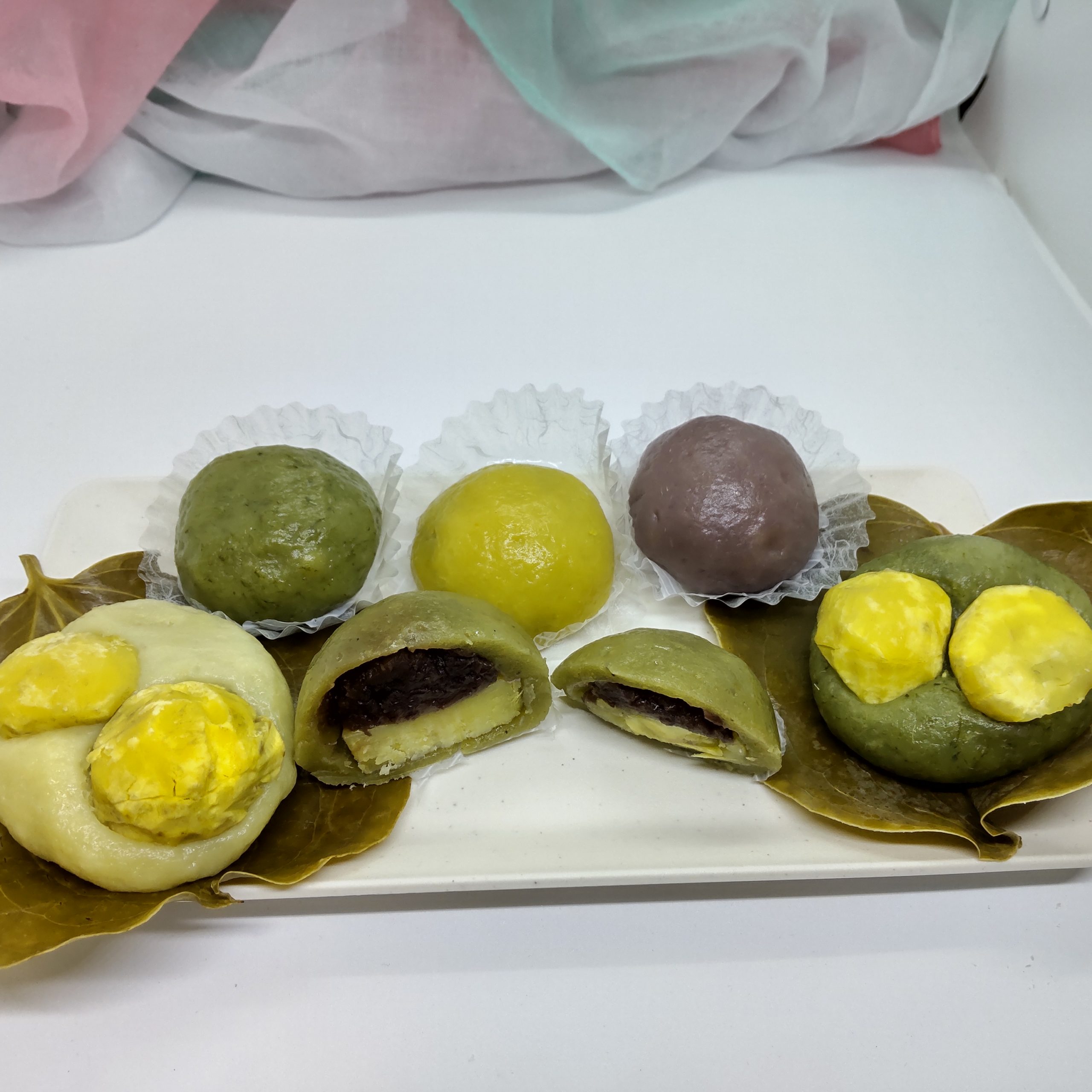 彩り良く、よもぎや紫いも、かぼちゃを生地に混ぜています。中はいもあんとつぶあん♪