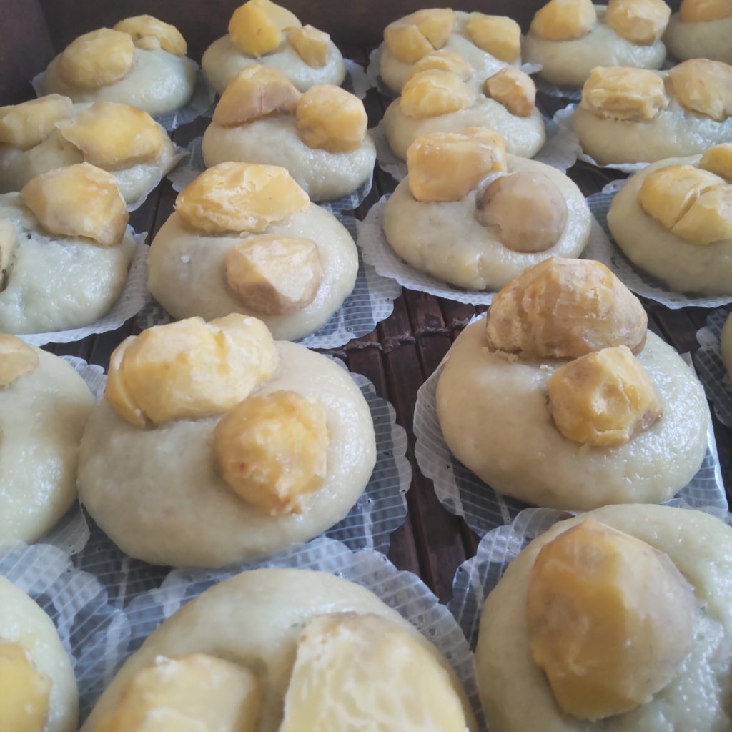 一つ一つ丁寧に鬼皮・渋皮をむき、蒸しただけの大きい栗をまんじゅうに乗せています。