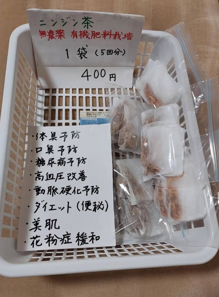 立石さんの畑で無農薬栽培する、ニンジンを焙煎して作られている自家製ニンジン茶です。