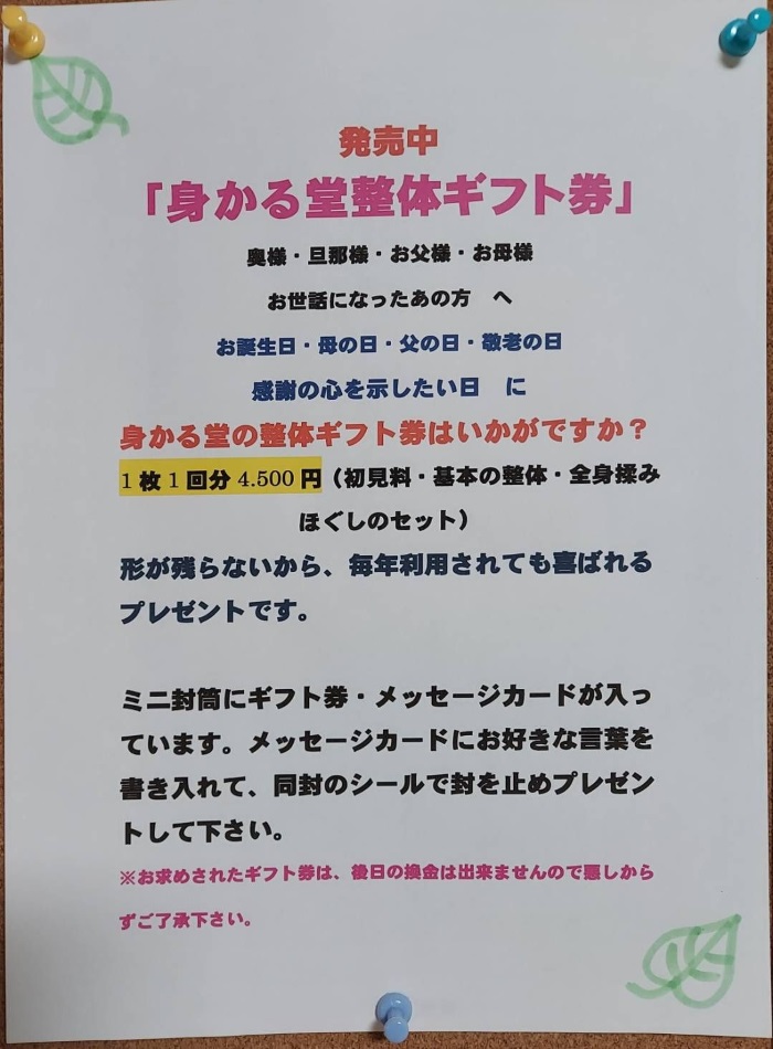 お世話になっている人への贈り物にピッタリな「整体ギフト券」です。