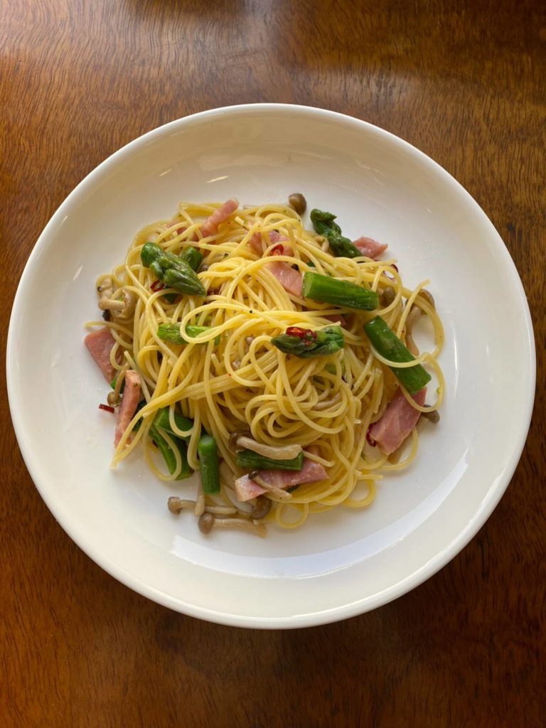 新鮮なアスパラガスやシューシーなベーコンがたっぷりと入った一皿です。