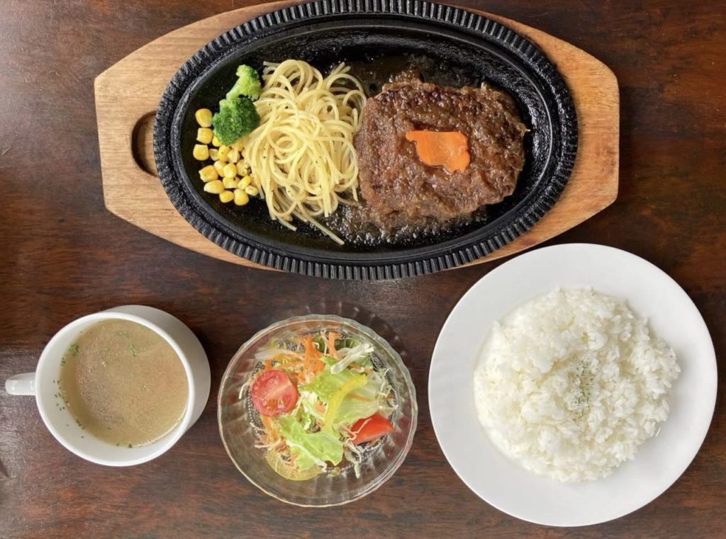 熱々の鉄板に、肉厚なハンバーグと新鮮な野菜がふんだんに盛られ、そのボリュームは圧巻の一言。