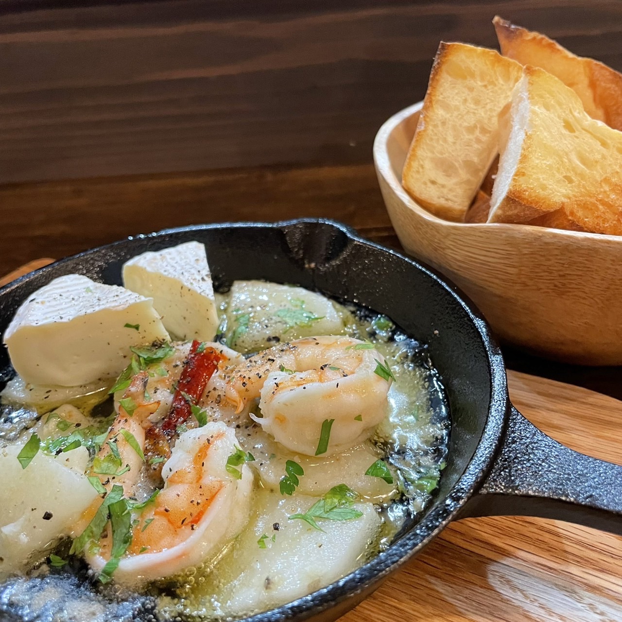 ●海老と長芋、カマンベールチーズのアヒージョ