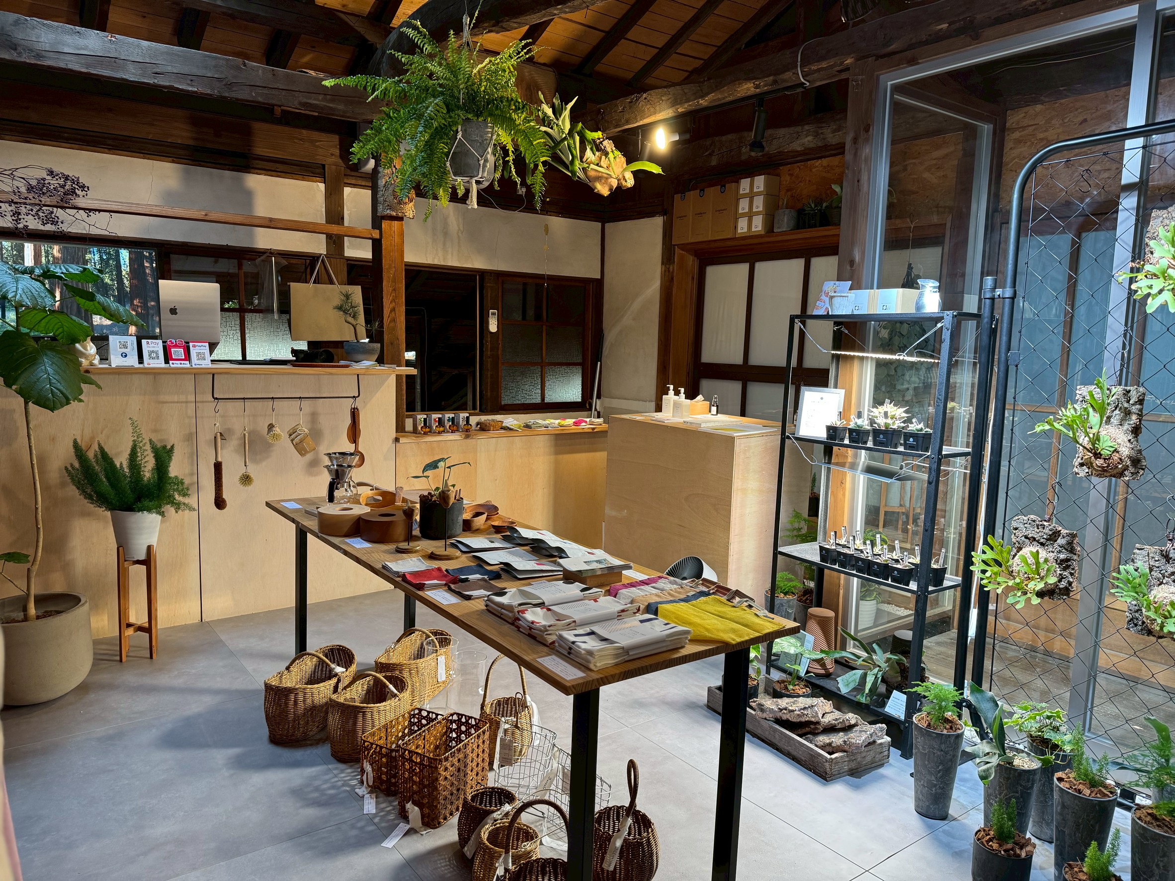 古民家をリノベーションした空間には、個性豊かな植物と、自然由来・サステナブルにこだわった雑貨が並びます。