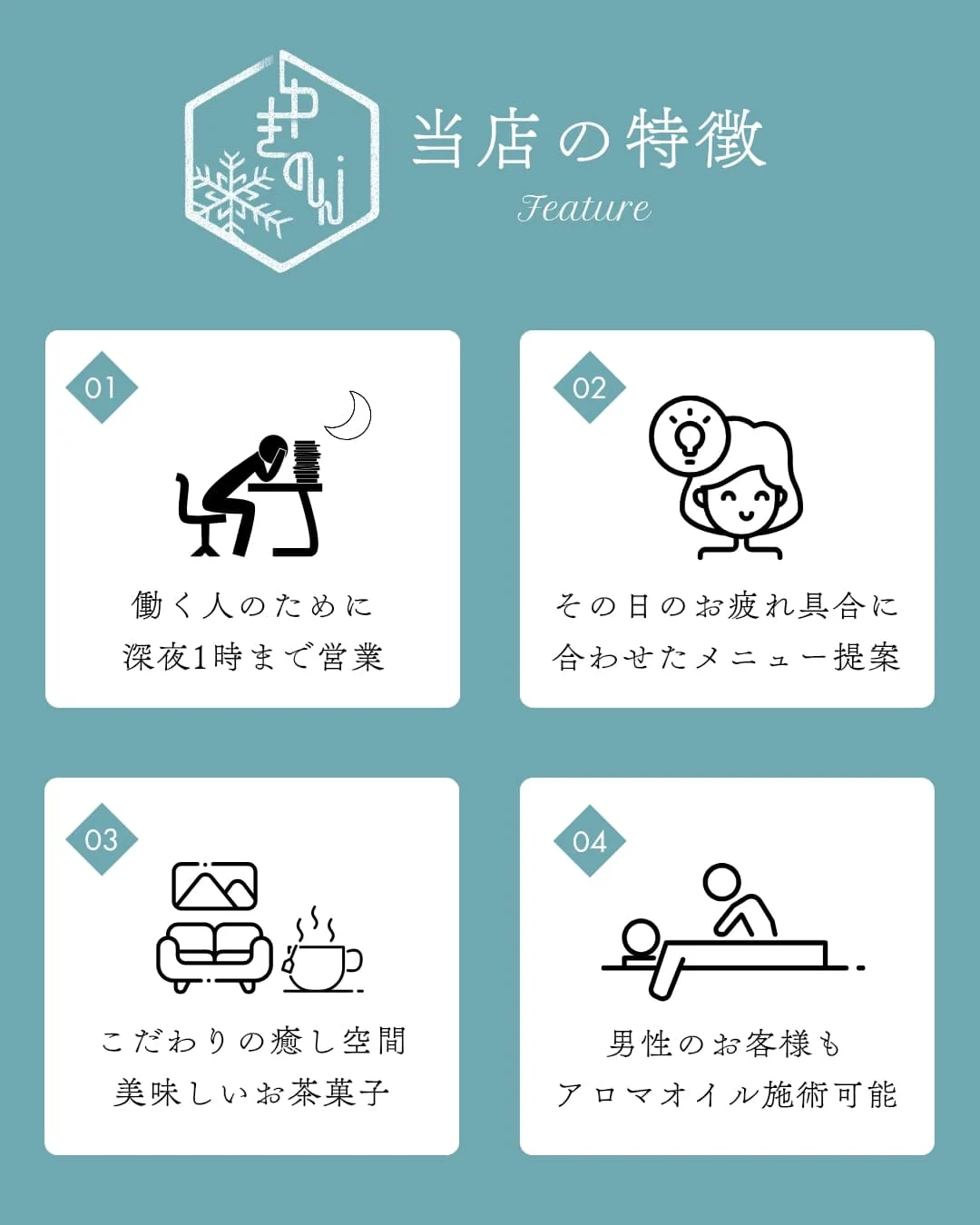 深夜1時まで営業、男性利用も歓迎。“働く人、頑張る人”に寄り添うサロンです。