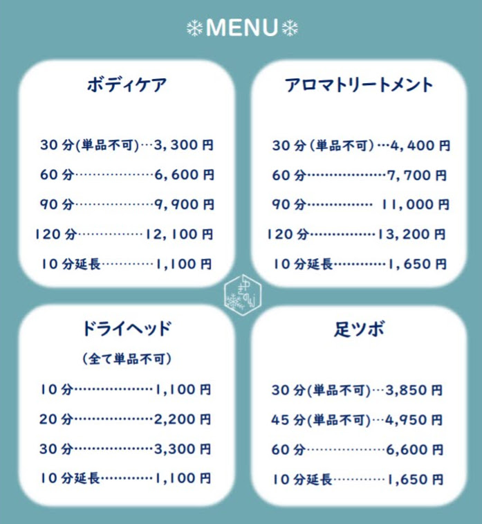 同サロンで提供されているのは、ボディケアとアロマトリートメントの大きく2つのメニューがあります。